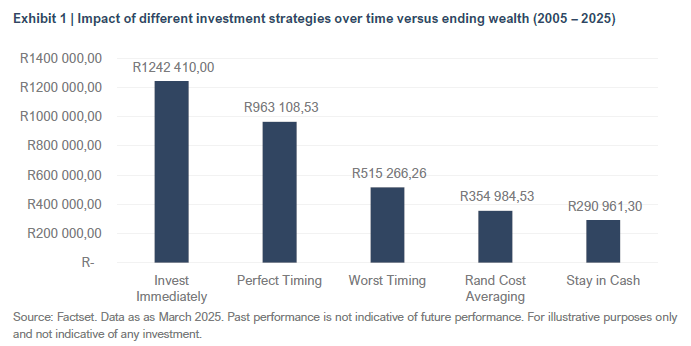Exhibit 1 below shows the impact of different investment strategies over time and compares the final value of R100,000 over a 20-year period (March 2005 – March 2025) across different investment strategies using ALSI returns: