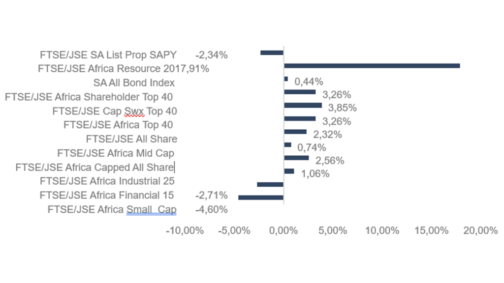 After three months of losses, the JSE rebounded in January, with the FTSE JSE All Share Index rising 2.2% and the Capped SWIX up 2.6%. Precious metals miners led the gains as gold and palladium prices soared, pushing resource stocks nearly 18% higher. Luxury giant Richemont also surged, supported by strong sales growth. Meanwhile, financials, property stocks, and local retailers struggled, with clothing brands facing pressure from weaker sales.