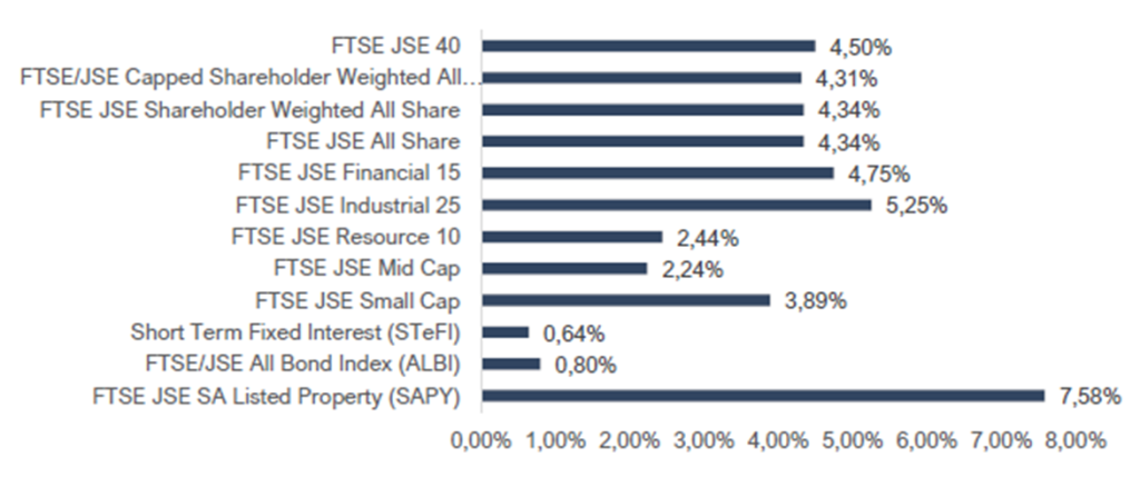 Local equity markets performed strongly in April. The JSE Top 40 Index rose by 4.5%, with gains seen across the board. The Capped SWIX index was up 4.3%, supported by a recovery in resource and industrial shares. Listed property was the standout performer, gaining 7.6%, while industrials also rallied nearly 5.3% during the month. Gold shares drove resource stocks higher, although platinum counters remained under pressure. Financials were modestly positive, up 4.8%.