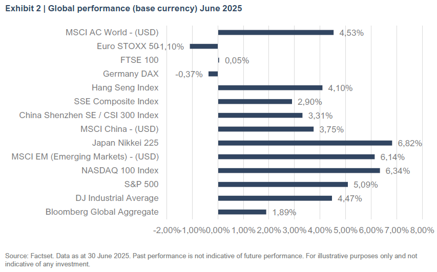 US equity markets rallied strongly in June, brushing off mid-month volatility driven by geopolitical tensions and ongoing tariff uncertainty. The Nasdaq 100 led the gains with a 6.3% return, followed by the S&P 500 and Dow Jones returning 5.0% and 4.5%, respectively. Markets were unsettled briefly by US military action in the Middle East, but investor sentiment recovered quickly as tensions eased, and optimism returned following a temporary pause in tariff escalations and progress in US-China trade talks. Large-cap tech stocks powered the rebound, helping erase earlier losses from the first quarter.