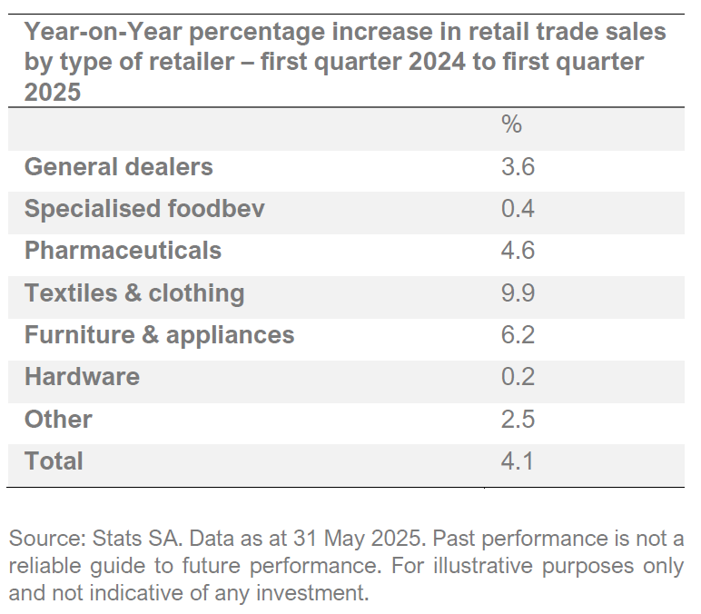 The latest data on retail trade sales also needs to take cognisance of the recent spike in the indicators for long-term insurance surrenders and lump-sum pension payments. These have been influenced by the so-called two-pot retirement system, which commenced in the third quarter of 2024 and has led to a significant increase in retirement fund withdrawals. Little doubt exists over the positive impact of these withdrawals on the value of retail trade sales. The table lists the real year-on-year growth rates during the first quarter of 2025 for the different types of retailers.