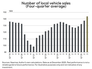 During the third quarter of 2025, the number of vehicle sales in South Africa increased by 20% (year-on-year) and by 17% (quarter-on-quarter) to reach a record high of more than 52,000 units. The figure shows the sharp decline in vehicle sales during the worst of the Covid-19 pandemic, followed by a remarkably swift recovery to virtually the same level as prior to Covid-19, mainly as a result of pent-up demand and the fact that the prime rate was lowered from 10% to 7%.