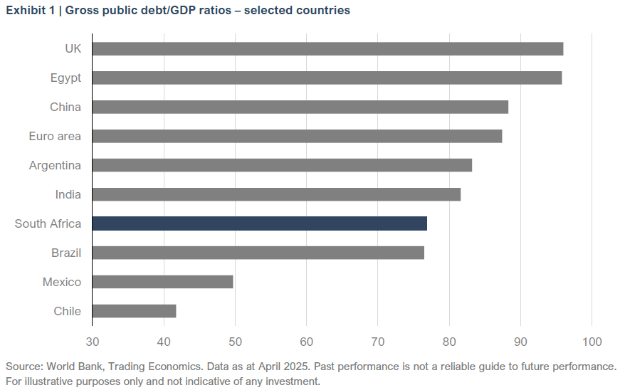 Several economists have raised concerns over the high and increasing level of public debt in South Africa. Whilst this indicator always requires a watchful eye, two observations should be borne in mind before ringing the alarm bells. Firstly, South Africa’s public debt/GDP ratio is not out of kilter with many emerging market peers nor several key trading partners, as illustrated by the graph below.